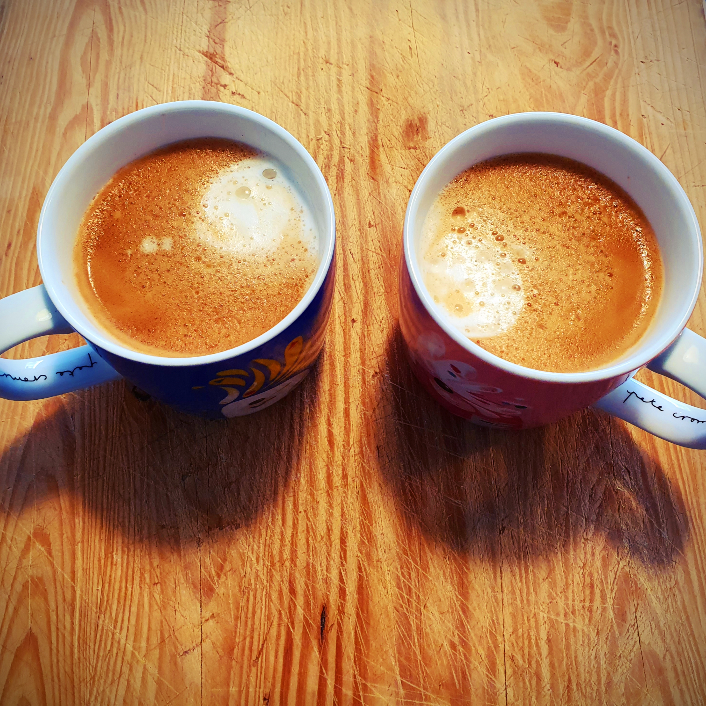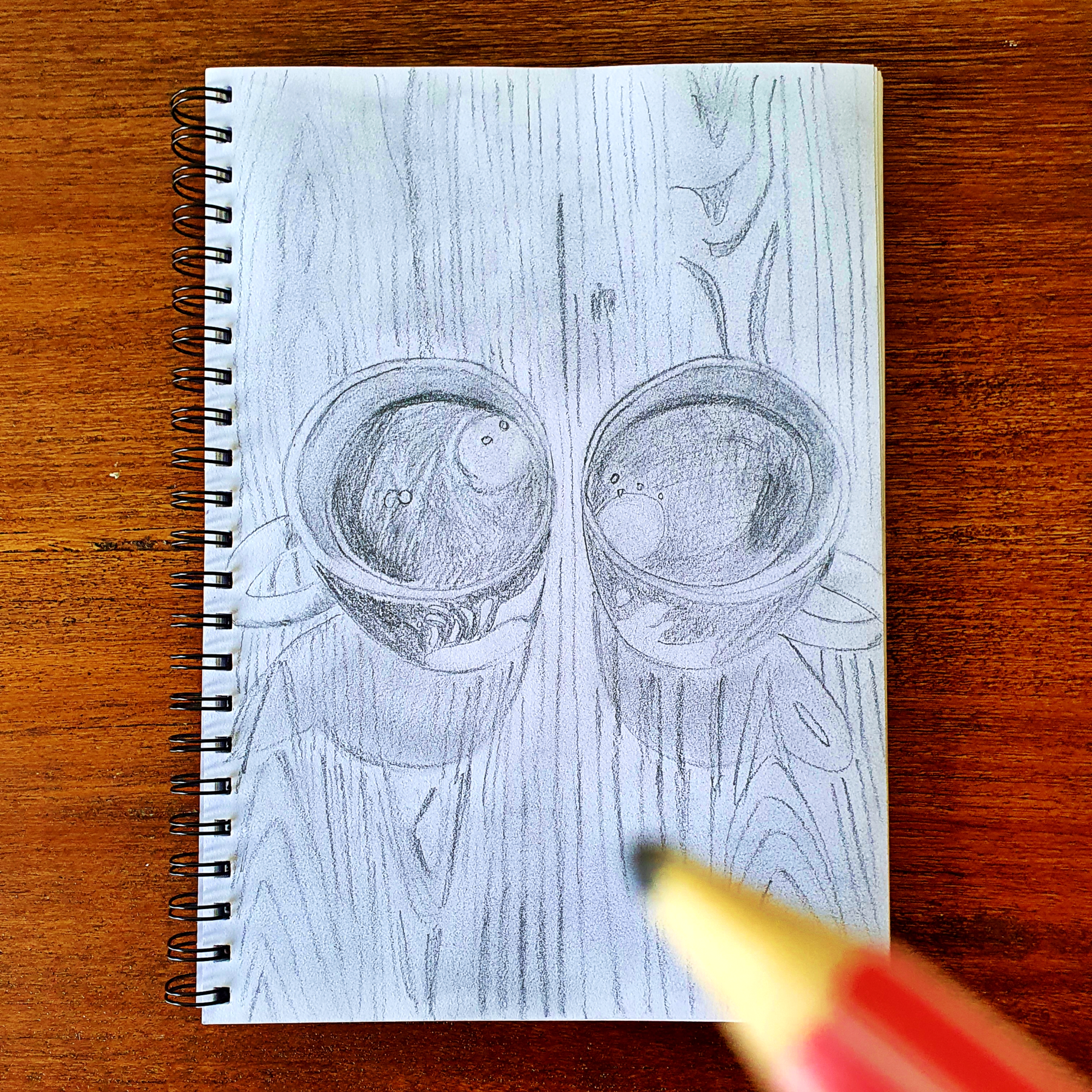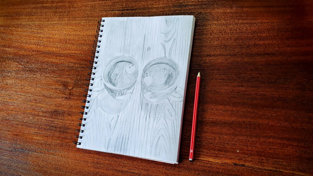 I’ve never considered myself to be visually artistic. I’ve spent most of my life exploring the performing arts. I have no expectations of my abilities when it comes to sketching so it came as no surprise to me that I enjoyed the creative process immensely. It was the most creative flow I’ve felt in a long time. I’ve chosen to draw the coffee cups which my husband and I use at the start of each day. I’m grateful to have a coffee machine at home as the recent lockdown meant the forced shutdown of our local café. Here is an image which captures my homemade coffee and the associated conversations shared over breakfast.