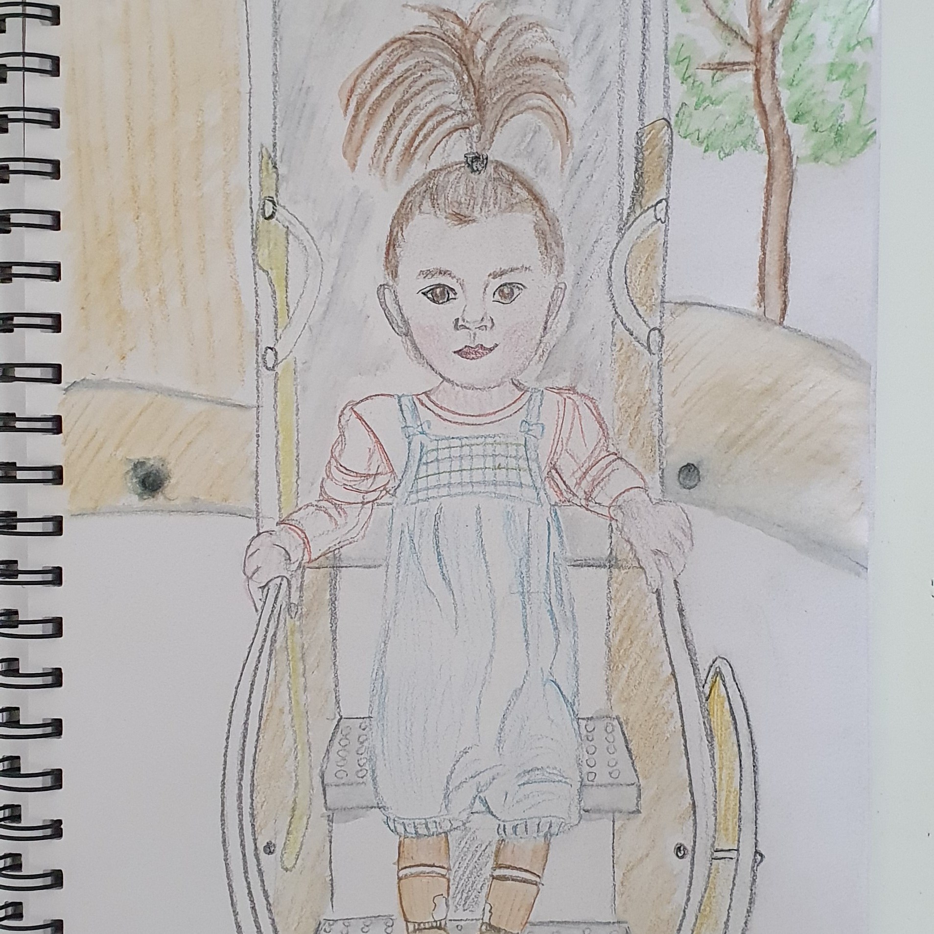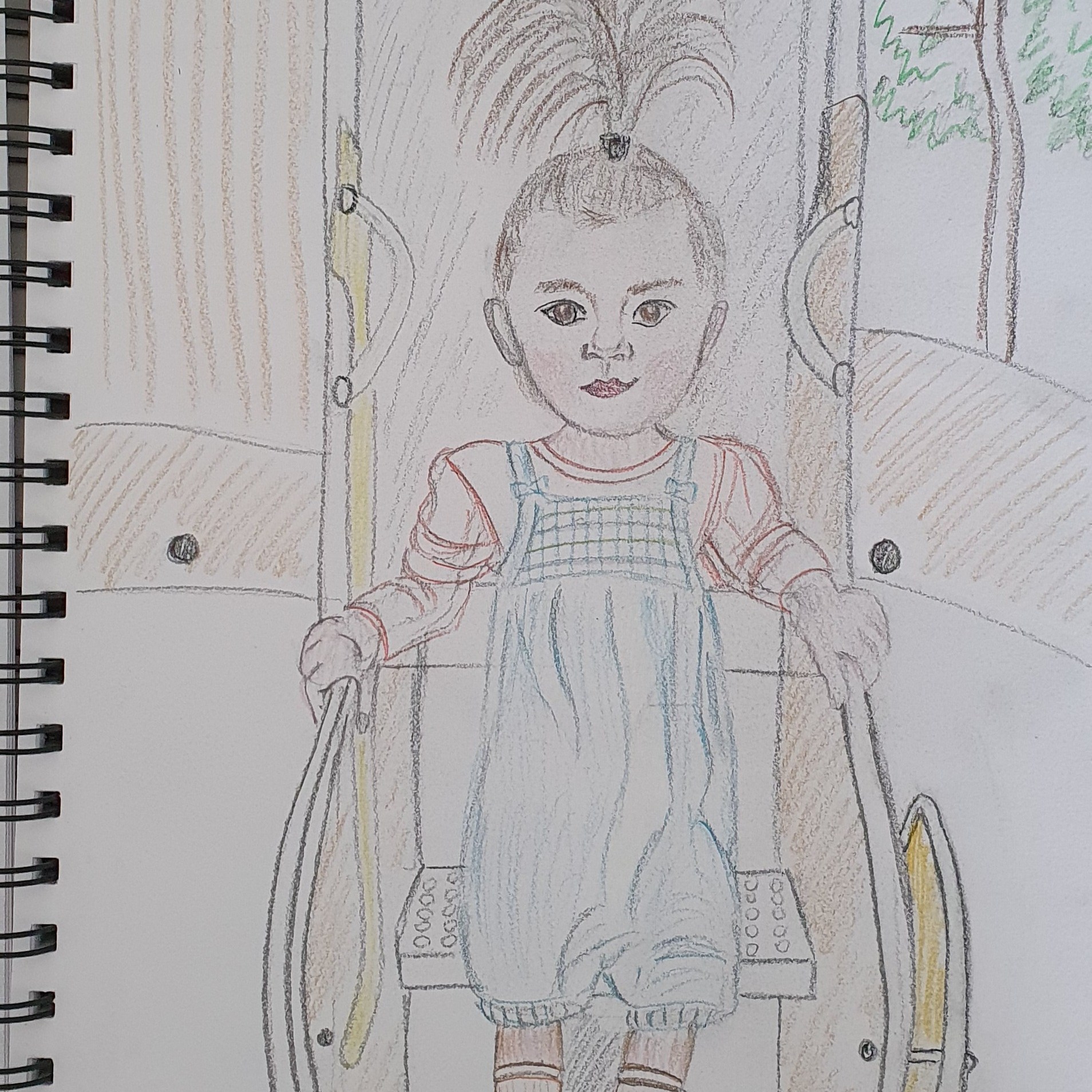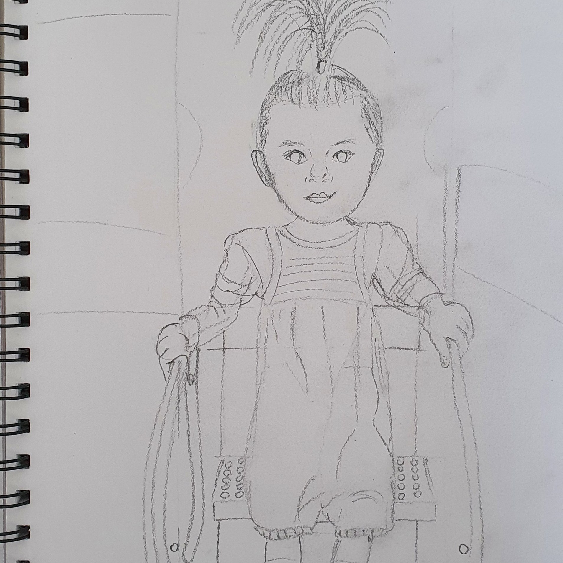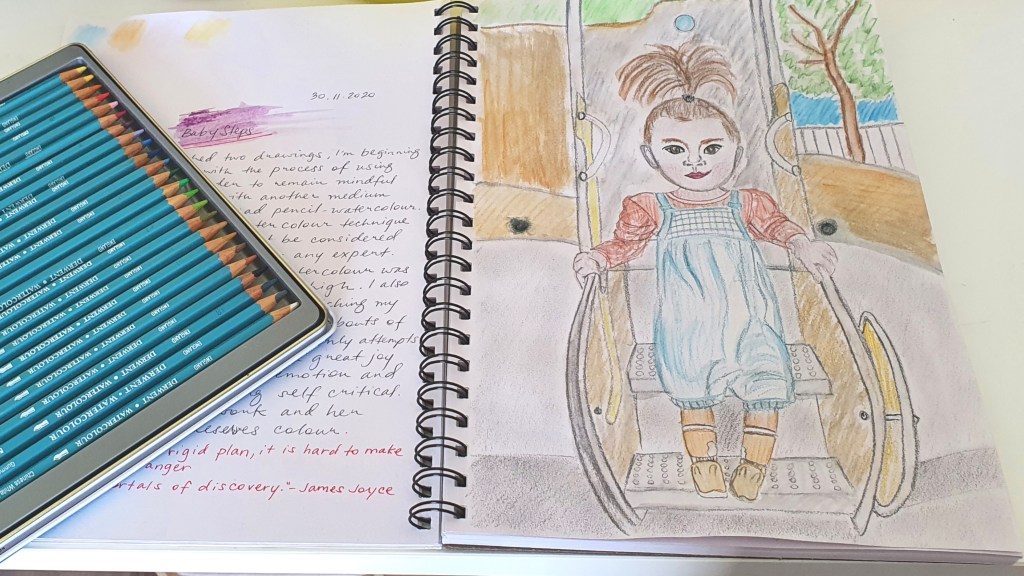 In the interest of keeping my mindfulness high and my hesitations low, I proceeded with little regard for potential criticism. Furthermore, I chose my toddler as the subject. People often don’t introduce new elements this early when adopting a new skill but I had nothing to lose and I wanted to create joyfully so I chose to draw Jasmine. My one-year old daughter brings me great joy so I focused on the positive emotions of my relationship with her and tried to refrain from being self critical. Jasmine inspired this work which I’ve titled Baby Steps. Her vibrant personality deserves colour. She’s also a curious risk taker so she was the perfect subject for this creative adventure.