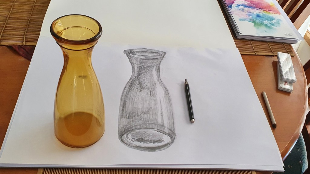 He gave me some sound advice along with some art tools and encouraged me to keep practising my new skills. Armed with a weighted lead pencil and a pad of butcher’s paper I attempted to draw a simple subject, an empty glass vase.
